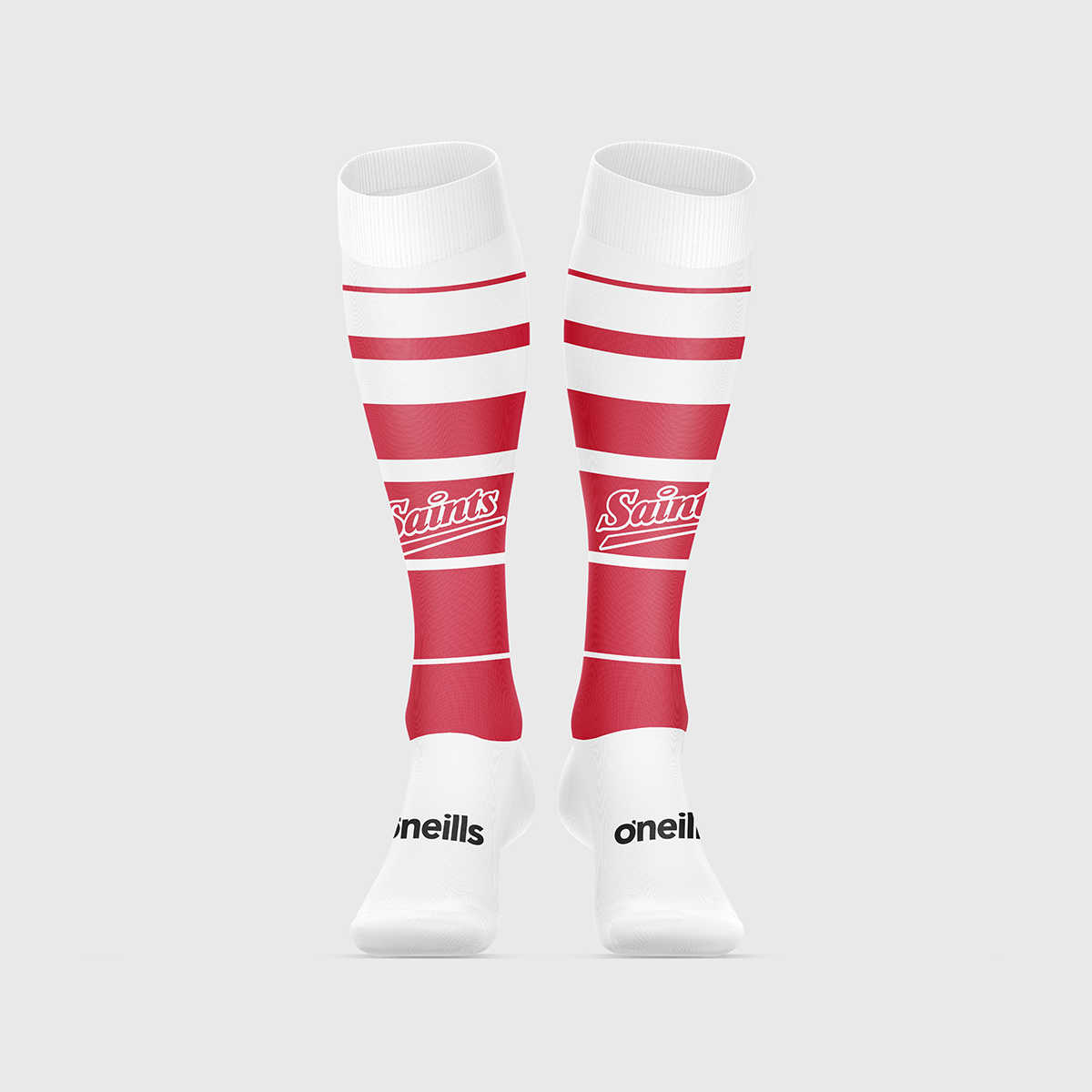 Saints Women's Team Adult Replica Socks for 2026 are white with red bands. The front shin of the sock has the outline of our Saints logo of old.