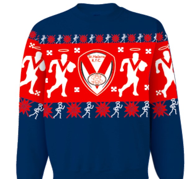 Navy jumper with a thick red band around the middle with central club logo and Saints player logo running either side and n the sleeves.
