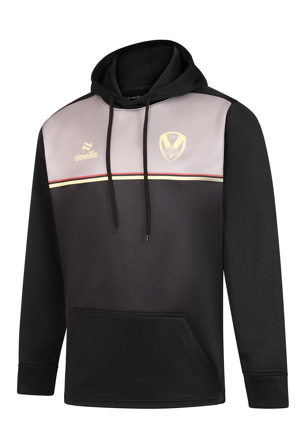 The Hoody has a Black body,sleeves and hood. The chest panel is Stone Grey with a 2 colour line across the centre chest, and above that there is a tonal Saints crest on the left chest and O'Neill's logo on the right chest.
