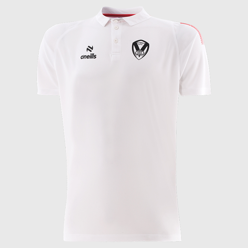 The Polo has a White body, with a red contrast panel on the upper front chest, and red flash on each sleeve. There is a tonal crest on the left chest and an O'Neill's logo on the right chest.