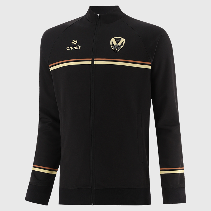 The Jacket has a Black body, with black Cuff and hem. There is a 2 colour line across the centre, and above that there is a tonal Saints crest on the left chest and O'Neill's logo on the right chest.