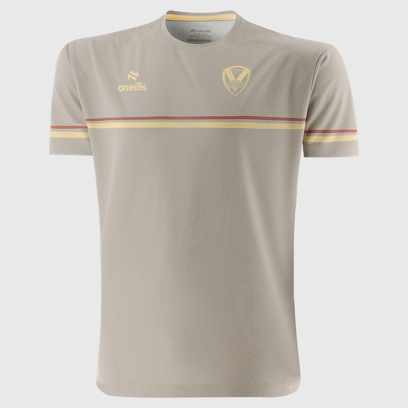 The T-Shirt is a Stone coloured body, with a modern stylish two colour line on the upper front chest and Sleeves. There is a tonal crest and O'Neill's logo above the line.