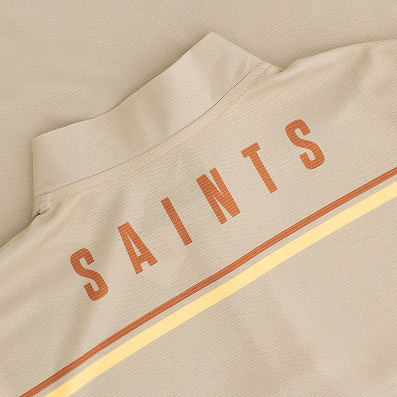 On the back of the Top there are similar 2 colour lines with the text Saints above it in Rust coloured text.