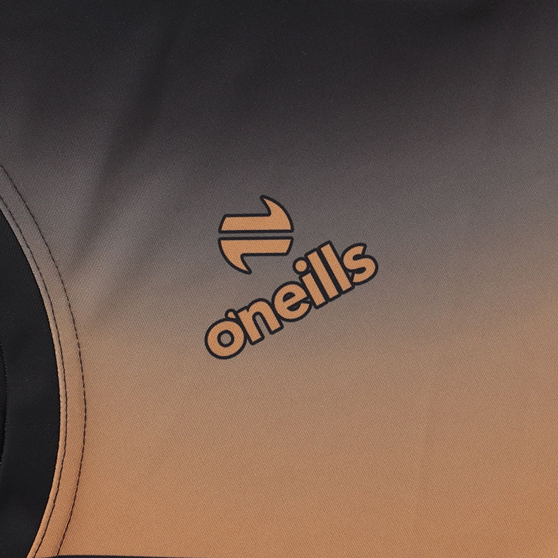 The vest is a Black body, with a gold chevron on the upper front chest. There is a tonal gold crest and O'Neill's logo within the chevron.